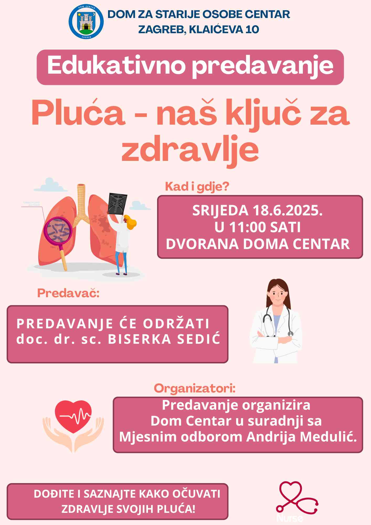 Pozivamo vas na edukativno predavanje „Pluća – naš ključ za zdravlje“ koje će se održati u srijedu 18.6.2025. u 11:00 sati u dvorani Doma za starije osobe Centar, Klaićeva 10. Predavanje se organizira u suradnji s Mjesnim odborom Andrija Medulić, a održati će ga doc.dr.sc. Biserka Sedić.
